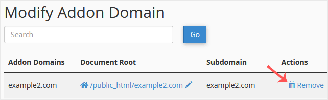 3. Locate the addon domain under Modify Addon Domain and click on Remove.