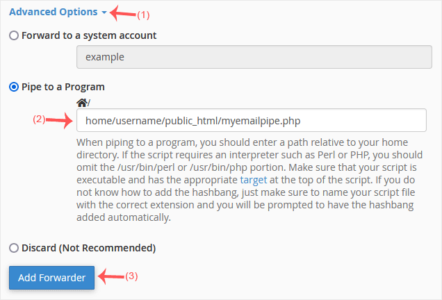 3. In the Destination field, click on Advanced Options, select Pipe to a Program and enter the full path of your pipe script, such as home/username/public_html/myemailpipe.php